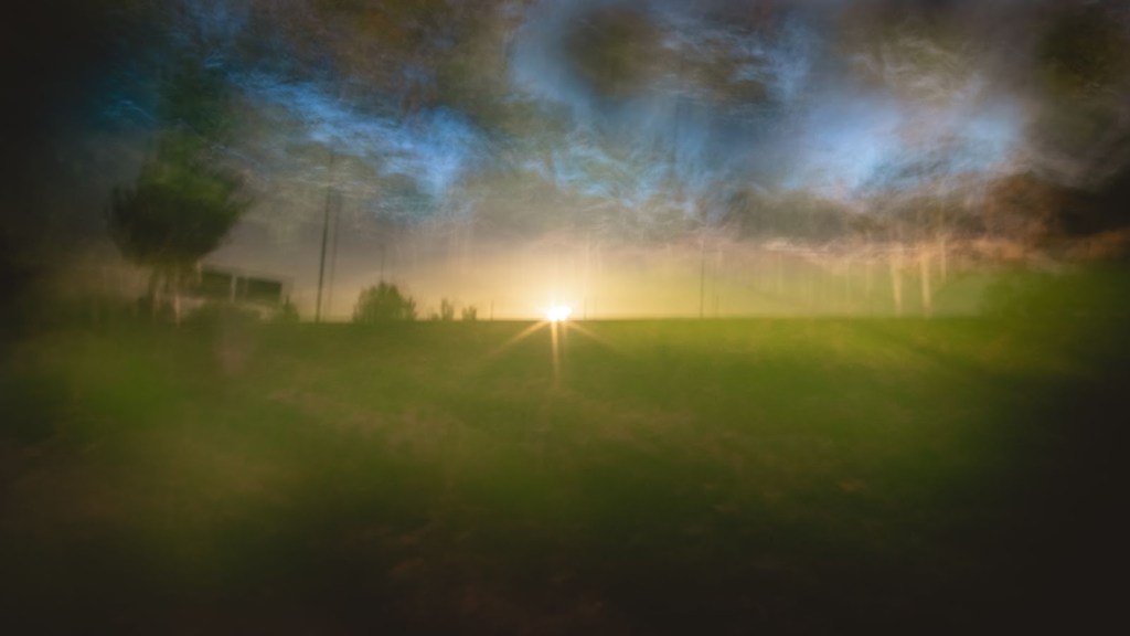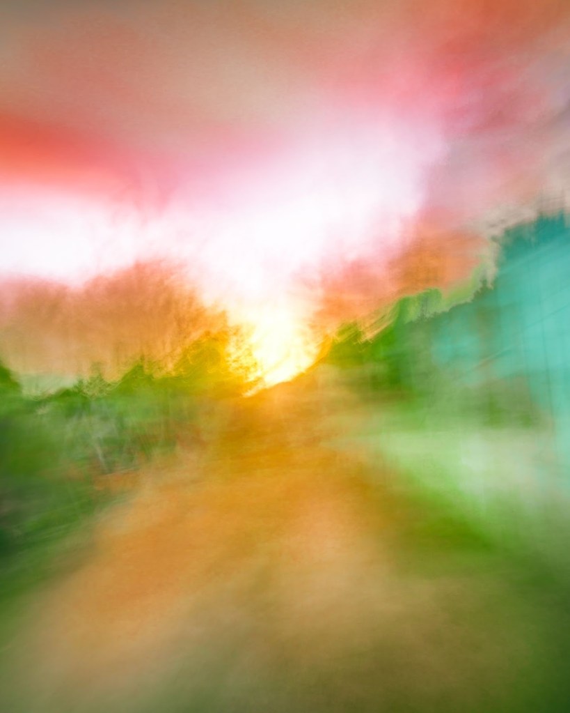 Organic Sun completely dissolved into its surroundings. From the center of the frame, a heart of yellow light emerges, extending along a warm path toward the viewer. To the right, the rectangular volume of a residence is discernible, bathed in greens and yellows that tint its facade. Hedges and trees grow along the sides, merging with this light. Above, a large pinkish-magenta mass blends with cooler areas, like a ceiling of clouds tinted between the golden hour and the blue hour. There is no defined disk or halo: the entire neighborhood is the “body” of the sun.