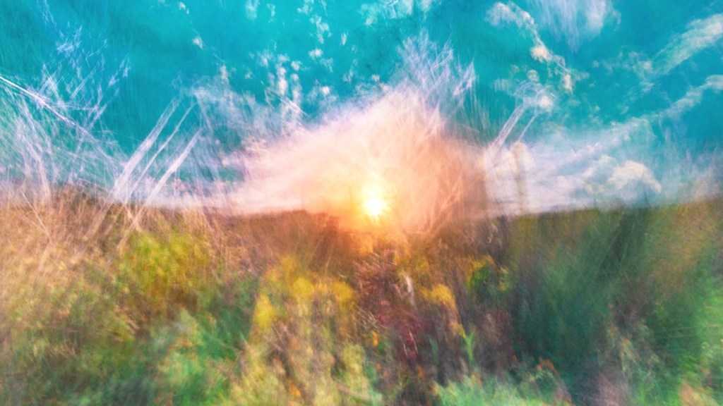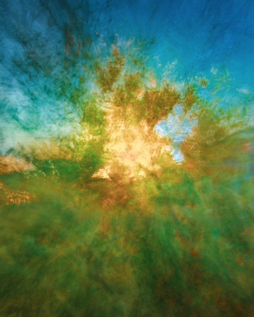 Organic Sun almost entirely dissolved into the landscape. There is no clear disk or core: the golden light spreads like a broad band across the image horizontally, merging with bushes and branches. At the bottom, a dense mass of greens dominates; in the center, the gold intertwines with the vegetation, creating small sparks and filaments of light among the leaves; Above, the blue of the sky falls like a soft veil that barely has a boundary with the rest. The solar halo does not end at any specific edge: it has become atmosphere, the “luminous skin” of the entire landscape.