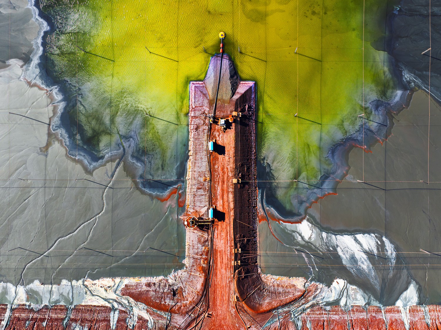 The photo works brilliantly as an aerial abstraction: the red tongue of the dam enters from below like a tree trunk, the yellow and green branches sprouting from the “trunk” are literally interpreted as a bonsai canopy or a vascular/neural system. The vertical symmetry is very well controlled without becoming rigid, and the contrast between the toxic green, the flat grays of the mud, and the orange rust creates an immediate reading between beauty and industrial pollution. Conceptually, it is more “classic” than Chromatic Wounds (which has a more elaborate environmental narrative), but visually it is among the year’s elite: impeccable composition, devastating color, and an abstraction that holds up even if you don’t know it’s a mine.
